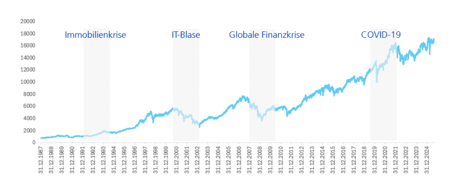 Fluctuations in financial markets often unsettle investors, frequently leading to hasty sell-offs. The Swiss Performance Index (SPI) (see Graphic 2) has weathered significant challenges since 1987, including a real estate bubble, an IT bubble, a global financial crisis, and, most recently, a pandemic. However, it has consistently managed to recover from all setbacks over time.